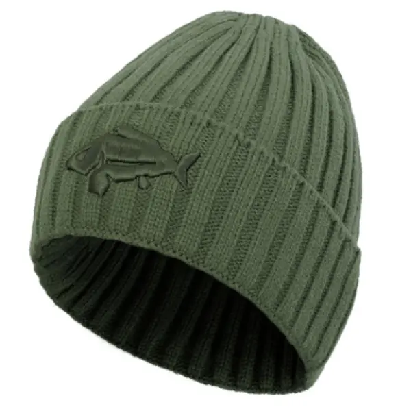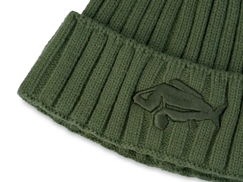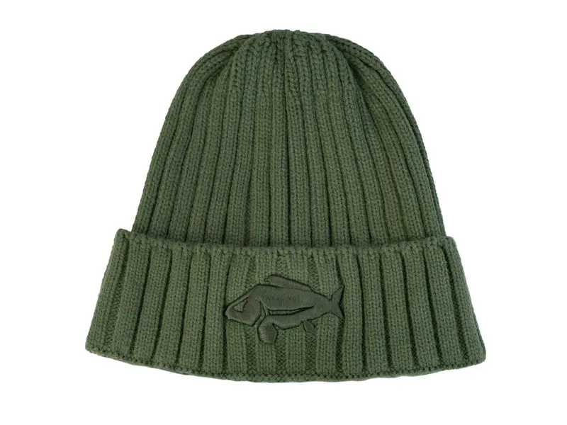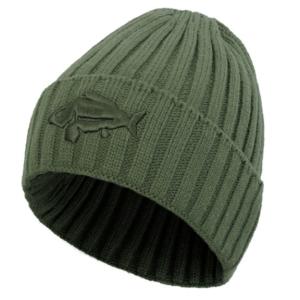 Zielona dzianinowa czapka zimowa z naszym oryginalnym wzorem OutLINE, który szczególnie ucieszy entuzjastów wędkarstwa karpiowego.