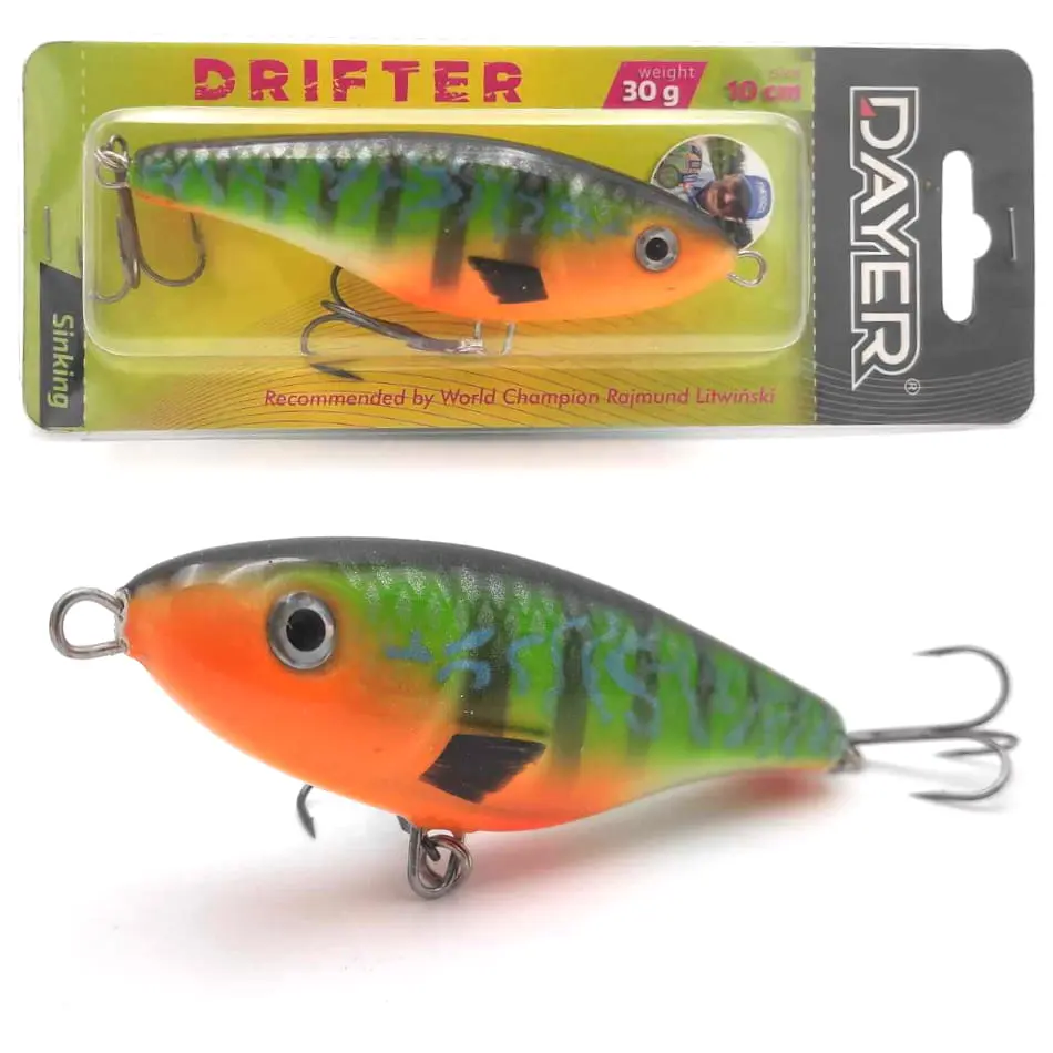 Dlaczego Dayer Drifter? Duże drapieżniki bardzo chętnie polują na ofiary, których pochwycenie nie wymaga od nich zbyt wiele wysiłku. Energia potrzebna do wykonania ataku musi być jak najmniejsza. Wielki szczupak, ogromny okoń, czy leciwy snadacz: takie ryby nie będą uganiały się bez końca za zdrową, pełną wigoru rybką. Np. nie bez kozery mówi się, że szczupak to doktor naszych wód. Ta ryba, tak jak i inne drapieżniki, najchętniej pożre ofiarę w słabej kondycji, a bezwarunkowo zaatakuje rybę konającą. Jerk Dayer został skonstruowanay w taki sposób, aby jak najwierniej odwzorować naturalny pokarm, który za chwilę ma kopnąć w przysłowiowy kalendarz, Oprócz klasycznego ruchu na boki jerk Drifter w ostatnie fazie ruchu wykłada się na brzuch, co jest sygnałem dlka drapieżnika do natychmiastowego ataku.