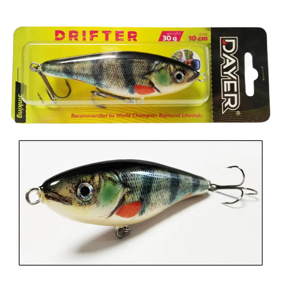 Dlaczego Dayer Drifter? Duże drapieżniki bardzo chętnie polują na ofiary, których pochwycenie nie wymaga od nich zbyt wiele wysiłku. Energia potrzebna do wykonania ataku musi być jak najmniejsza. Wielki szczupak, ogromny okoń, czy leciwy snadacz: takie ryby nie będą uganiały się bez końca za zdrową, pełną wigoru rybką. Np. nie bez kozery mówi się, że szczupak to doktor naszych wód. Ta ryba, tak jak i inne drapieżniki, najchętniej pożre ofiarę w słabej kondycji, a bezwarunkowo zaatakuje rybę konającą. Jerk Dayer został skonstruowanay w taki sposób, aby jak najwierniej odwzorować naturalny pokarm, który za chwilę ma kopnąć w przysłowiowy kalendarz, Oprócz klasycznego ruchu na boki jerk Drifter w ostatnie fazie ruchu wykłada się na brzuch, co jest sygnałem dlka drapieżnika do natychmiastowego ataku.