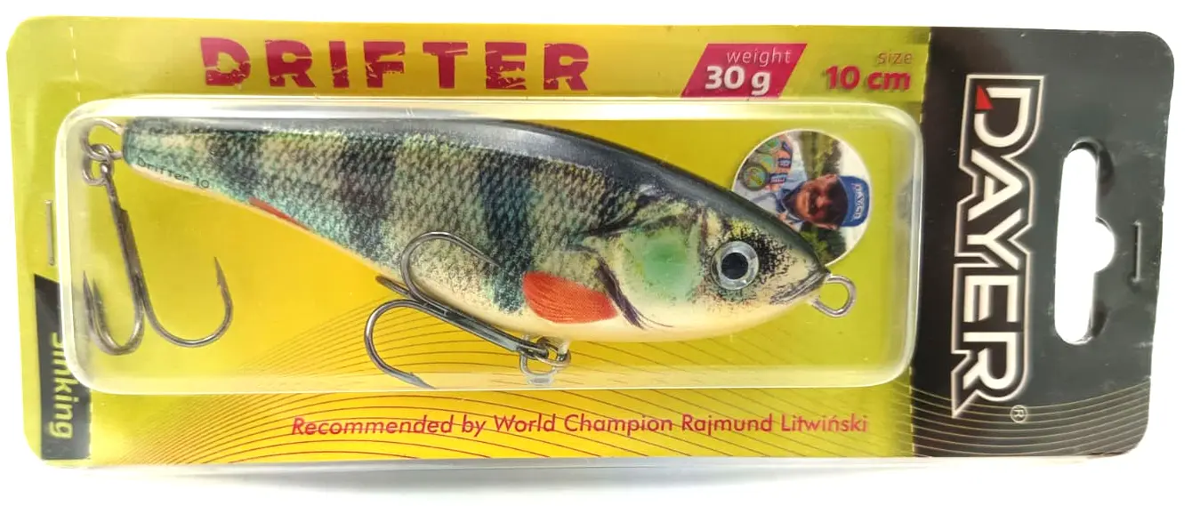 Dlaczego Dayer Drifter? Duże drapieżniki bardzo chętnie polują na ofiary, których pochwycenie nie wymaga od nich zbyt wiele wysiłku. Energia potrzebna do wykonania ataku musi być jak najmniejsza. Wielki szczupak, ogromny okoń, czy leciwy snadacz: takie ryby nie będą uganiały się bez końca za zdrową, pełną wigoru rybką. Np. nie bez kozery mówi się, że szczupak to doktor naszych wód. Ta ryba, tak jak i inne drapieżniki, najchętniej pożre ofiarę w słabej kondycji, a bezwarunkowo zaatakuje rybę konającą. Jerk Dayer został skonstruowanay w taki sposób, aby jak najwierniej odwzorować naturalny pokarm, który za chwilę ma kopnąć w przysłowiowy kalendarz, Oprócz klasycznego ruchu na boki jerk Drifter w ostatnie fazie ruchu wykłada się na brzuch, co jest sygnałem dlka drapieżnika do natychmiastowego ataku.