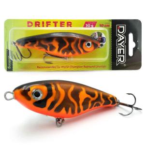 Dlaczego Dayer Drifter? Duże drapieżniki bardzo chętnie polują na ofiary, których pochwycenie nie wymaga od nich zbyt wiele wysiłku. Energia potrzebna do wykonania ataku musi być jak najmniejsza. Wielki szczupak, ogromny okoń, czy leciwy snadacz: takie ryby nie będą uganiały się bez końca za zdrową, pełną wigoru rybką. Np. nie bez kozery mówi się, że szczupak to doktor naszych wód. Ta ryba, tak jak i inne drapieżniki, najchętniej pożre ofiarę w słabej kondycji, a bezwarunkowo zaatakuje rybę konającą. Jerk Dayer został skonstruowanay w taki sposób, aby jak najwierniej odwzorować naturalny pokarm, który za chwilę ma kopnąć w przysłowiowy kalendarz, Oprócz klasycznego ruchu na boki jerk Drifter w ostatnie fazie ruchu wykłada się na brzuch, co jest sygnałem dlka drapieżnika do natychmiastowego ataku.