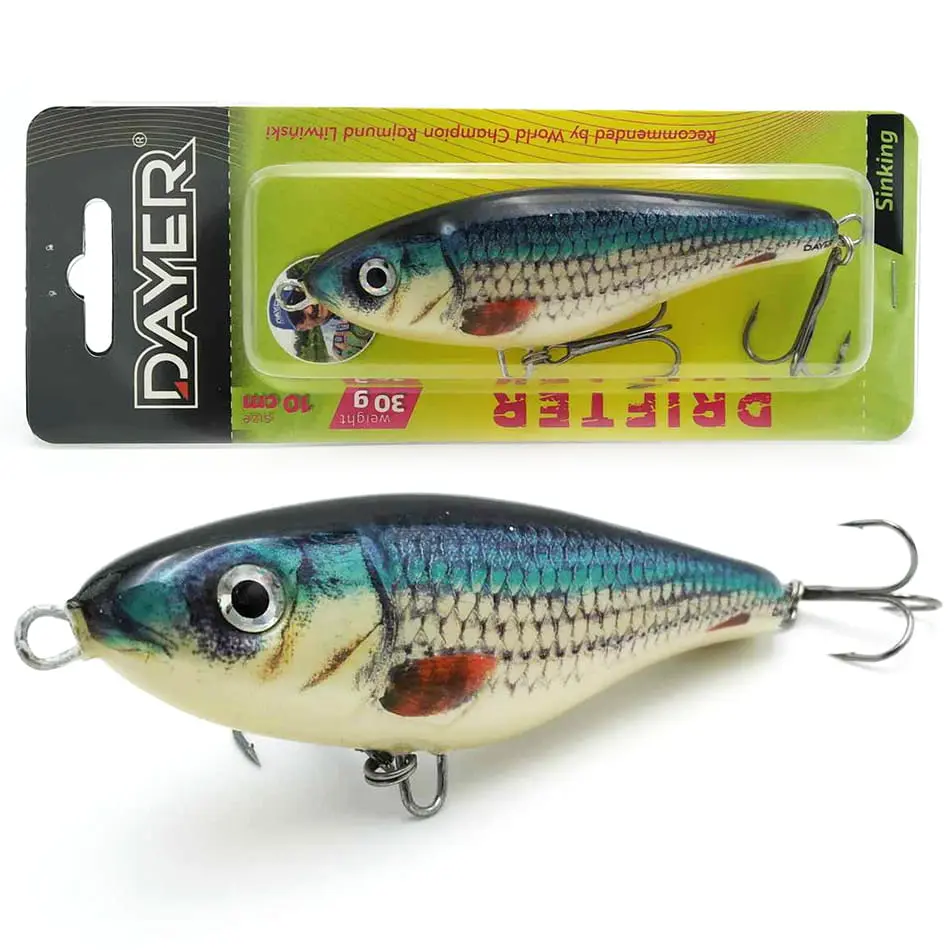 Dlaczego Dayer Drifter? Duże drapieżniki bardzo chętnie polują na ofiary, których pochwycenie nie wymaga od nich zbyt wiele wysiłku. Energia potrzebna do wykonania ataku musi być jak najmniejsza. Wielki szczupak, ogromny okoń, czy leciwy snadacz: takie ryby nie będą uganiały się bez końca za zdrową, pełną wigoru rybką. Np. nie bez kozery mówi się, że szczupak to doktor naszych wód. Ta ryba, tak jak i inne drapieżniki, najchętniej pożre ofiarę w słabej kondycji, a bezwarunkowo zaatakuje rybę konającą. Jerk Dayer został skonstruowanay w taki sposób, aby jak najwierniej odwzorować naturalny pokarm, który za chwilę ma kopnąć w przysłowiowy kalendarz, Oprócz klasycznego ruchu na boki jerk Drifter w ostatnie fazie ruchu wykłada się na brzuch, co jest sygnałem dlka drapieżnika do natychmiastowego ataku.