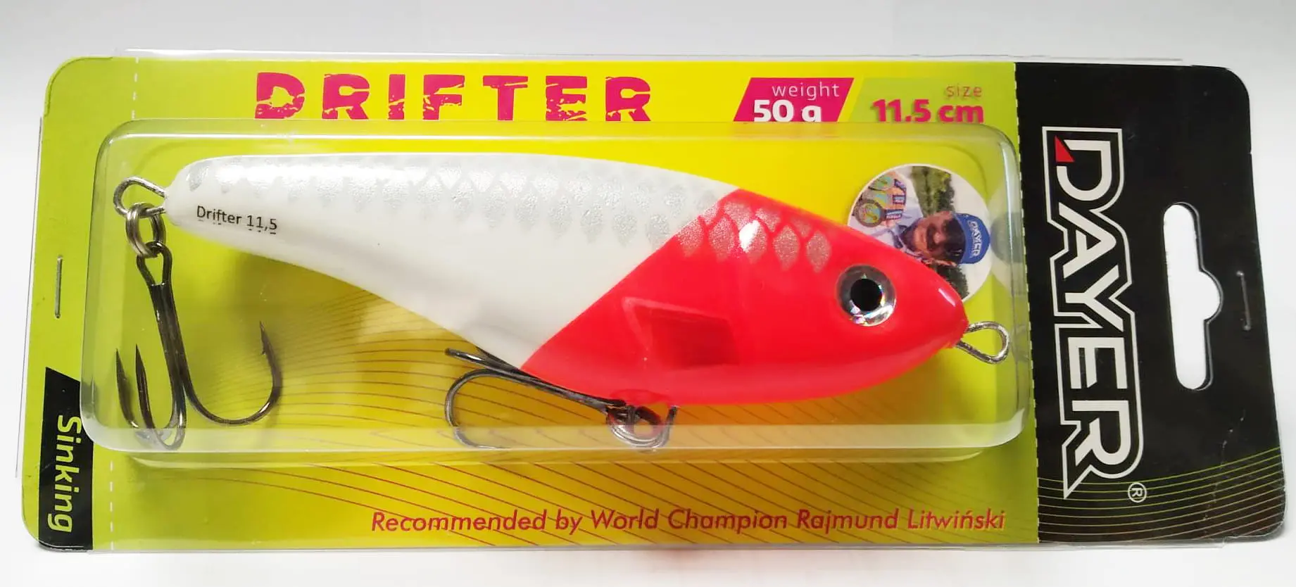 Dlaczego Dayer Drifter? Duże drapieżniki bardzo chętnie polują na ofiary, których pochwycenie nie wymaga od nich zbyt wiele wysiłku. Energia potrzebna do wykonania ataku musi być jak najmniejsza. Wielki szczupak, ogromny okoń, czy leciwy snadacz: takie ryby nie będą uganiały się bez końca za zdrową, pełną wigoru rybką. Np. nie bez kozery mówi się, że szczupak to doktor naszych wód. Ta ryba, tak jak i inne drapieżniki, najchętniej pożre ofiarę w słabej kondycji, a bezwarunkowo zaatakuje rybę konającą. Jerk Dayer został skonstruowanay w taki sposób, aby jak najwierniej odwzorować naturalny pokarm, który za chwilę ma kopnąć w przysłowiowy kalendarz, Oprócz klasycznego ruchu na boki jerk Drifter w ostatnie fazie ruchu wykłada się na brzuch, co jest sygnałem dlka drapieżnika do natychmiastowego ataku.