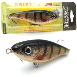 Dlaczego Dayer Drifter? Duże drapieżniki bardzo chętnie polują na ofiary, których pochwycenie nie wymaga od nich zbyt wiele wysiłku. Energia potrzebna do wykonania ataku musi być jak najmniejsza. Wielki szczupak, ogromny okoń, czy leciwy snadacz: takie ryby nie będą uganiały się bez końca za zdrową, pełną wigoru rybką. Np. nie bez kozery mówi się, że szczupak to doktor naszych wód. Ta ryba, tak jak i inne drapieżniki, najchętniej pożre ofiarę w słabej kondycji, a bezwarunkowo zaatakuje rybę konającą. Jerk Dayer został skonstruowanay w taki sposób, aby jak najwierniej odwzorować naturalny pokarm, który za chwilę ma kopnąć w przysłowiowy kalendarz, Oprócz klasycznego ruchu na boki jerk Drifter w ostatnie fazie ruchu wykłada się na brzuch, co jest sygnałem dlka drapieżnika do natychmiastowego ataku.