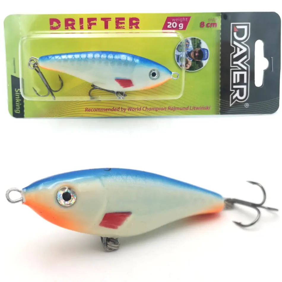 Dlaczego Dayer Drifter? Duże drapieżniki bardzo chętnie polują na ofiary, których pochwycenie nie wymaga od nich zbyt wiele wysiłku. Energia potrzebna do wykonania ataku musi być jak najmniejsza. Wielki szczupak, ogromny okoń, czy leciwy snadacz: takie ryby nie będą uganiały się bez końca za zdrową, pełną wigoru rybką. Np. nie bez kozery mówi się, że szczupak to doktor naszych wód. Ta ryba, tak jak i inne drapieżniki, najchętniej pożre ofiarę w słabej kondycji, a bezwarunkowo zaatakuje rybę konającą. Jerk Dayer został skonstruowanay w taki sposób, aby jak najwierniej odwzorować naturalny pokarm, który za chwilę ma kopnąć w przysłowiowy kalendarz, Oprócz klasycznego ruchu na boki jerk Drifter w ostatnie fazie ruchu wykłada się na brzuch, co jest sygnałem dlka drapieżnika do natychmiastowego ataku.