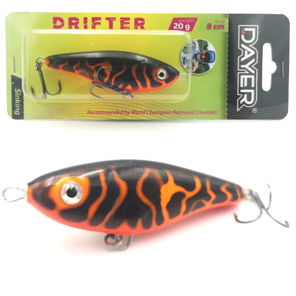 Dlaczego Dayer Drifter? Duże drapieżniki bardzo chętnie polują na ofiary, których pochwycenie nie wymaga od nich zbyt wiele wysiłku. Energia potrzebna do wykonania ataku musi być jak najmniejsza. Wielki szczupak, ogromny okoń, czy leciwy snadacz: takie ryby nie będą uganiały się bez końca za zdrową, pełną wigoru rybką. Np. nie bez kozery mówi się, że szczupak to doktor naszych wód. Ta ryba, tak jak i inne drapieżniki, najchętniej pożre ofiarę w słabej kondycji, a bezwarunkowo zaatakuje rybę konającą. Jerk Dayer został skonstruowanay w taki sposób, aby jak najwierniej odwzorować naturalny pokarm, który za chwilę ma kopnąć w przysłowiowy kalendarz, Oprócz klasycznego ruchu na boki jerk Drifter w ostatnie fazie ruchu wykłada się na brzuch, co jest sygnałem dlka drapieżnika do natychmiastowego ataku.