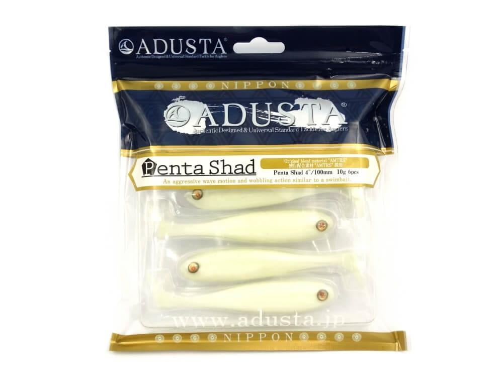 Guma Penta Shad o niedużym korpusie została opracowana w celu połączenia realistycznej pracy z dużym lusterkowaniem podobnym w działaniu do swimbaitów. Dzięki korpusowi w kształcie trójkąta, podobnej do stępki statku, przynęta ta jest w stanie pewnie i stabilnie poruszać się w wodzie. Zaprojektowana cieńsza podstawa ogona, umożliwia jego wyjątkowe płynne działanie, gdy faluje on z boku na bok. Przynęta w opadzie imituje ranną rybę usiłującą uciec na głębszą wodę. Wyprofilowany ogon uruchamia się do pracy natychmiast po dotknięciu wody. Grubość przynęty, w połączeniu z jej kilowym kształtem, umożliwia łatwe i horyzontalne prowadzenie w wodzie, a praca nie ulega zaburzeniom podczas zwijania. Materiały użyte w produkcji ADUSTA Penta Shad zapewniają, że korpus przynęty jest ustabilizowany podczas mocno falującej pracy ogona. Guma ta osiągnęła idealną równowagę pomiędzy kształtem a wagą, co pozwala jej podczas opadu realistycznie udawać ruchy rannej ryby opadającej w toń wody.