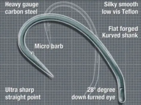 Wysokiej jakości haczyki karpiowe z zadziorem firmy Korda z serii Kurv Shank. Są to chyba najbardziej rozpoznawalne haki dostępne na rynku karpiowym. Niesamowicie ostre, a przede wszystkim wytrzymałe. Posiadają oczko wygięte do wewnątrz, okrągły łuk kolankowy i delikatny kształt banana. Czyni je to bardzo agresywnymi hakami, które bardzo dobrze zapinają ryby, ale przede wszystkim mocno je trzymają. Pokryte zostały antyrefleksyjną powłoką, która nie odbija promieni słonecznych.