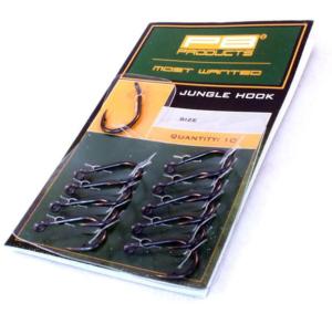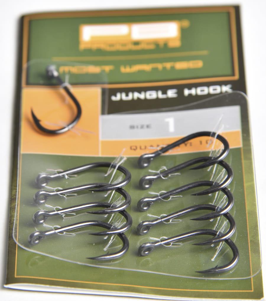 Haki Karpiowe Jungle (dżungla). Krótki trzonek, gruby i mocny drut, zagięte ostrze - to cechy charakterystyczne haków PB Products Jungle. Tego typu haki bardzo mocno trzymają rybę podczas holu i nadają się zarówno do przynęt pływających jak i tonących. Wszystkie haki PB Products pokryte są czarną matowa powłoką. Haki pakowane są w sposób uniemożliwiający ich tępieniu się w opakowaniu, posiadają niezwykle ostry grot, wykończone w technologii Dull Black Finish.