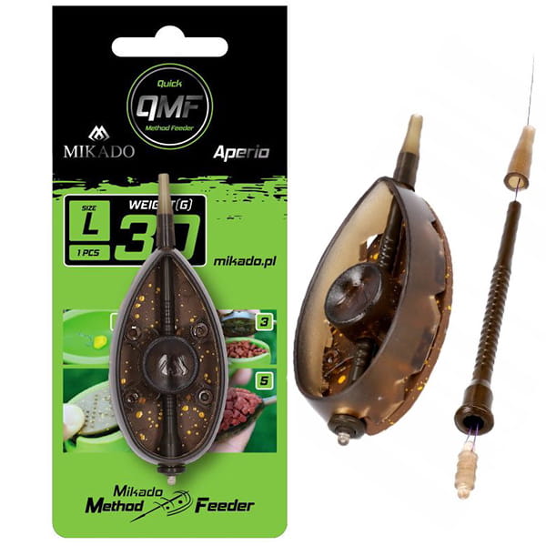 Jego ulepszoną wersję stanowi APERIO Q.M.F. SYSTEM. Wyposażenie w system Q.M.F. – Quick Method Feeder, to najnowsza innowacja w dziale koszyczków, stworzonych na potrzeby łowienia gruntowego.