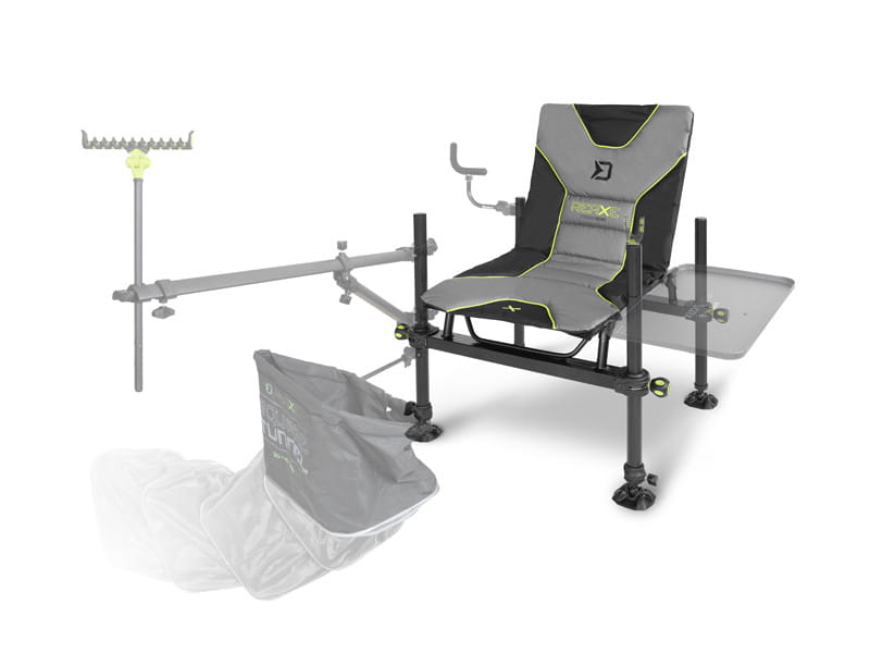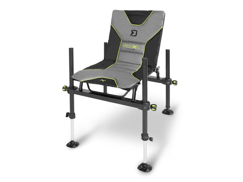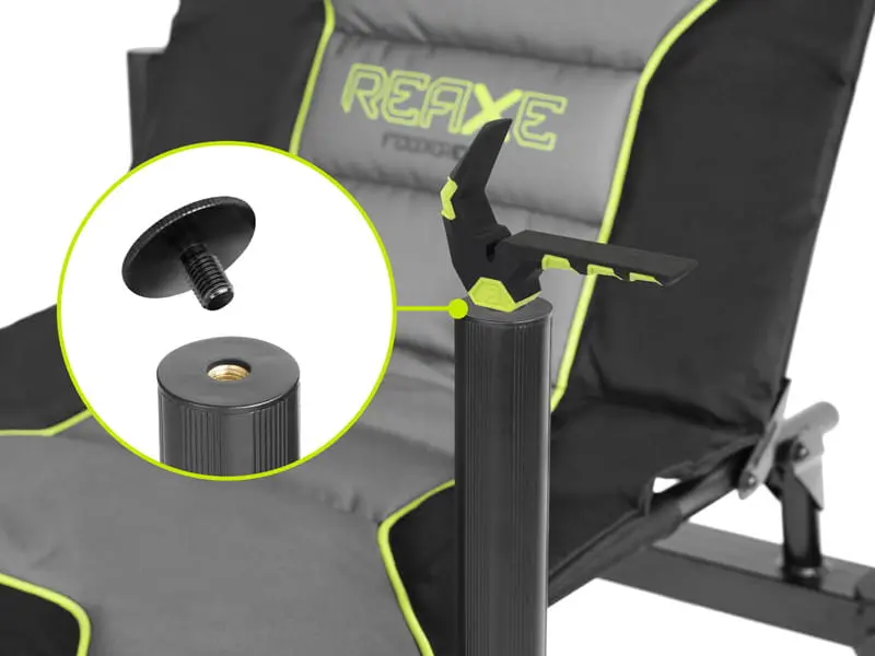 Na górze przednich nóg znajdują się uniwersalne gwinty do mocowania różnych uchwytów feederowych lub innych akcesoriów. Siedzisko składa się z miękkiego materaca zapewniającego wygodę przez cały dzień. Krzesło jest szare i czarne z odważnymi zielonymi elementami w stylu REAXE.