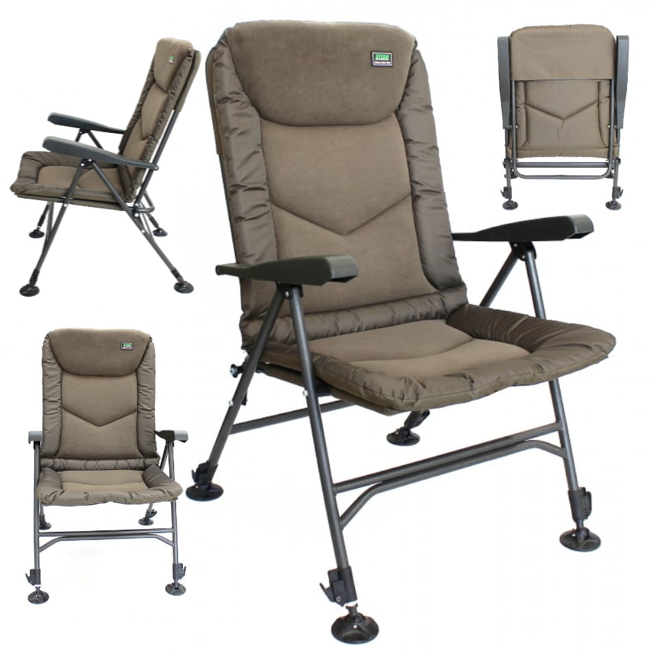 Zielone obramowanie jest wykonane z wodoodpornego materiału Ripstop. Krzesło wyróżnia się wysokim oparciem. Każdy doceni regulowane podłokietniki, które pozwalają na 8 różnych pozycji regulacji podłokietnika. Szerokie stopki w stopkach zapobiegają ich zapadaniu się w miękkim terenie, a dzięki szybkim klipsom regulacja stopek to pestka. To krzesło zapewnia maksymalny komfort nie tylko wędkarzom, ale wszystkim, którzy lubią wygodnie spędzać czas na łonie natury.