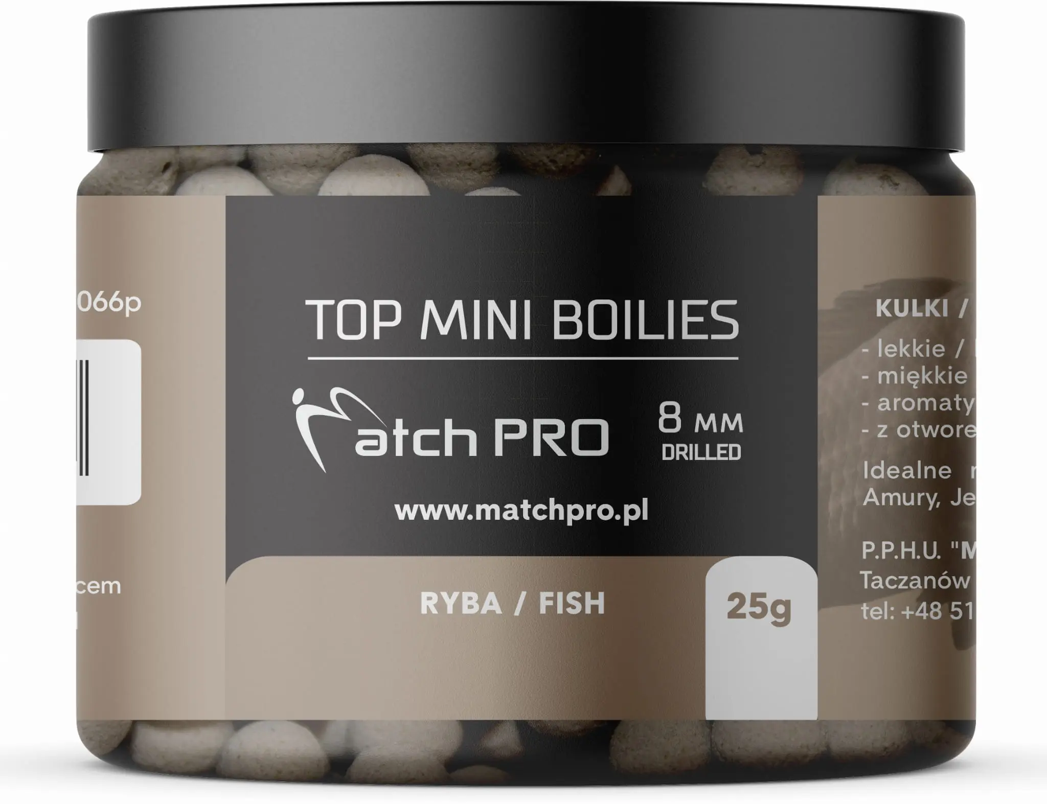 Seria najwyższej jakości przynęt w rozmiarze 8 mm. Długie i intensywne testy tych przynęt pozwoliły dopracować ich skład i właściwości tak aby były bardzo skuteczne w każdych warunkach. To co wyróżnia Matchpro Top Boiles to idealna miękkość, dzięki której ryby pewnie ją pobierają. Wyjątkowa lekkość kulki zapewnia bardzo naturalne zachowanie się w wodzie co niezwykle podnosi skuteczność łowienia. Top Matchpro Bolies są bardzo aromatyczne, oddając przez długi czas równomiernie aromat w wodzie co przekłada się na dużą ilość brań. Dodatkowo kulki posiadają otwór dzięki któremu bardzo łatwo i szybko można założyć przynętę. Różnorodność smaków i kolorów pozwala dopasować się każdemu wędkarzowi do aktualnych warunków panujących na łowisku.