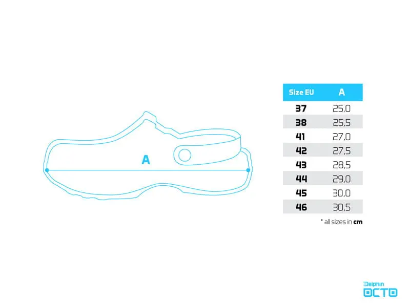 Kolejnymi wyszukanymi elementami są duże boczne otwory, których rolą jest zadbanie o wentylację i ogólną przewiewność tych butów. Nie są one celowo zaprojektowane na niskim poziomie, jak to jest w standardzie, ale nieco wyżej. To właśnie ten szczegół odgrywa ważną rolę podczas pobytu na brzegu lub w płytkiej wodzie. Dzięki temu, że otwory znajdują się nieco wyżej nad wkładką, niepożądane nagromadzenie piasku lub kamieni między podeszwą a stopą jest prawie wyeliminowane. Dzięki temu Twoje stopy są jak najlepiej chronione. Oprócz tych otworów wentylacją jest gruba perforacja znajdująca się w górnej części. Jest celowo ukształtowana z jednej strony w symbol D z logo Delphin, a z drugiej symbol O jako początkowa litera nazwy OCTO. Całkowite wrażenie dodatkowo potęguje delikatna struktura powierzchni podeszwy, która przywodzi na myśl skórę kałamarnicy. Dzięki zastosowanemu materiałowi EVA są niezwykle lekkie, wytrzymałe, a nawet unoszą się na wodzie. Oczywiście ten model posiada pętlę do mocowania pięty (popularnie nazywaną zapięciem), co docenisz zwłaszcza w nierównym lub pochyłym terenie.
