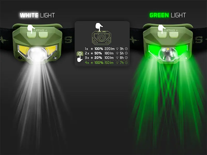 Czołówka wyposażona jest w dwie diody LED, co pozwala na przełączanie się między standardowym białym a zielonym światłem. Tryby świecenia zmienia się za pomocą przycisku zasilania. Białe światło można ustawić na jeden z trzech poziomów jasności: