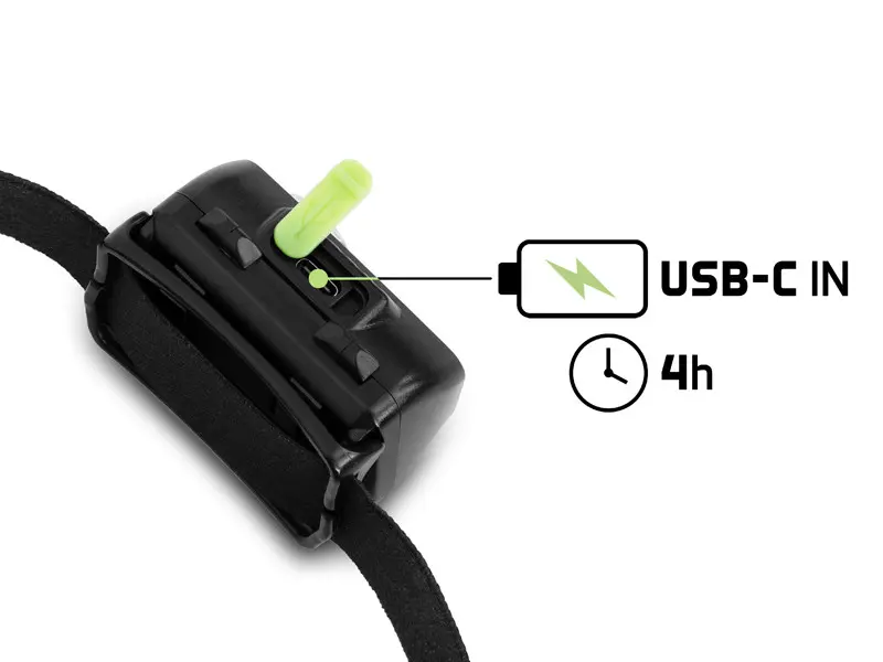 Czołówka posiada wbudowany akumulator o pojemności 1200 mAh, ładowany za pomocą kabla USB-C. Pełne naładowanie trwa 4 godziny. Na obudowie znajduje się wskaźnik poziomu naładowania baterii.