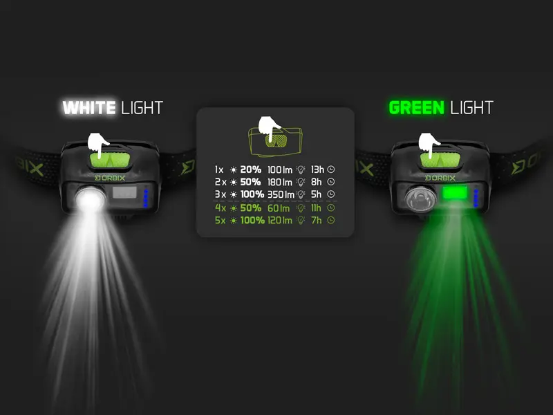 Czołówka posiada dwie diody LED – białą oraz zieloną. Po pierwszym naciśnięciu przycisku aktywuje się białe światło o mocy 20% (100 lm), które świeci przez 13 godzin. Drugie naciśnięcie uruchamia tryb 50% (czas świecenia: 8 godzin). Trzecie naciśnięcie włącza białe światło o maksymalnej mocy 100%, które działa przez 5 godzin.