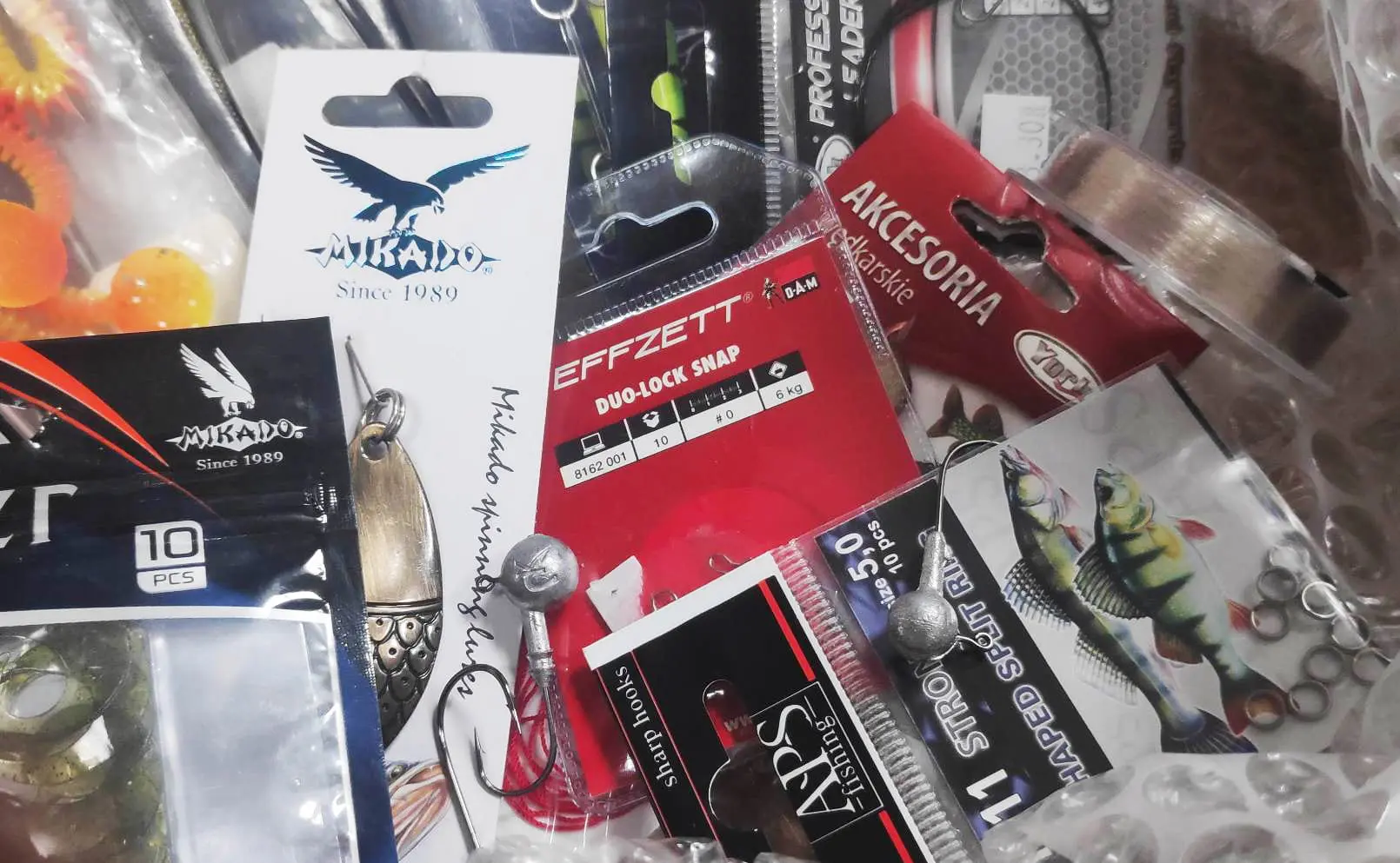 ◘ Wyselekcjonowane produkty w oryginalnych i szczelnie zamkniętych opakowaniach, takie jak: przynęty gumowe, woblery, stopery, haczyki, błystki wahadłowe i obrotowe, krętliki, główki jigowe.