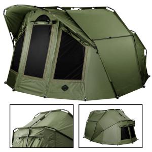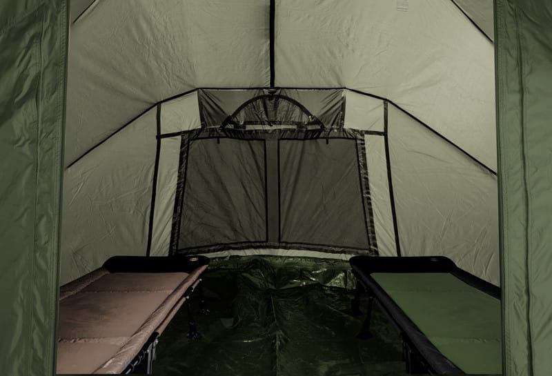 Nowa, ulepszona generacja króla wśród dużych namiotów. YURTA NEO wyróżnia się dużą przestrzenią, która stanowi doskonałe schronienie podczas długich pobytów nad wodą. Ustaw bez problemu 3 łóżka w środku i nadal jest wystarczająco dużo wolnego miejsca. Podstawą biwaku jest masywna konstrukcja trój żebrowa z górnymi rozpórkami wzmacniającymi. Dodatkowo posiada jednak dwie rozpórki po bokach, dzięki czemu namiot zyskuje jeszcze lepszą stabilność. W połączeniu z wysokiej jakości tkaniną i całkowicie podklejonymi szwami namiot ten poradzi sobie w każdych warunkach pogodowych. Z przodu duży daszek o długości aż 70 cm nad wejściem! Dzięki daszkowi nie będzie padać na żadne buty przed namiotem, a podczas silnej burzy zapobiegnie przedostawaniu się kropel deszczu na moskitiery drzwi. Daszek ma również dwa uchwyty na wędki. Wewnątrz dodatkowo 2 haczyki na suficie, na których można zawiesić np. lampę.