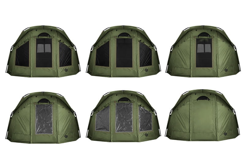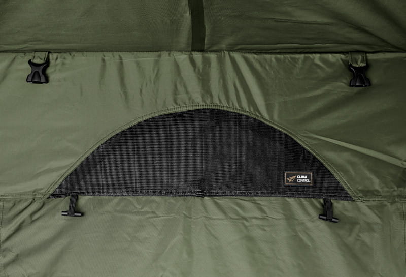 Z przodu oprócz drzwi znajdują się również dwa okna. Oba to moskitiery z możliwością wykorzystania okienek z przeźroczystej folii lub z pełnego materiału. Okna foliowe są częścią pakietu, więc nie musisz kupować nic więcej! Jednak w modelu YURTA NEO pomyśleliśmy również o lepszej wentylacji namiotu i zastosowaliśmy do niego nasz wyrafinowany system CLIMA CONTROL. System ten składa się z dwóch wentylatorów po przeciwnych stronach (nad przednimi drzwiami i nad tylną szybą). Dzięki temu genialnemu systemowi można zapewnić cyrkulację powietrza we wnętrzu biwaku w momencie, gdy nie ma możliwości wietrzenia przez duże okna. Z pewnością docenisz to szczególnie w nocy, kiedy to znacząco pomaga ograniczyć kondensację na ścianach wewnętrznych. Ponadto cały system jest łatwy w obsłudze od wewnątrz.