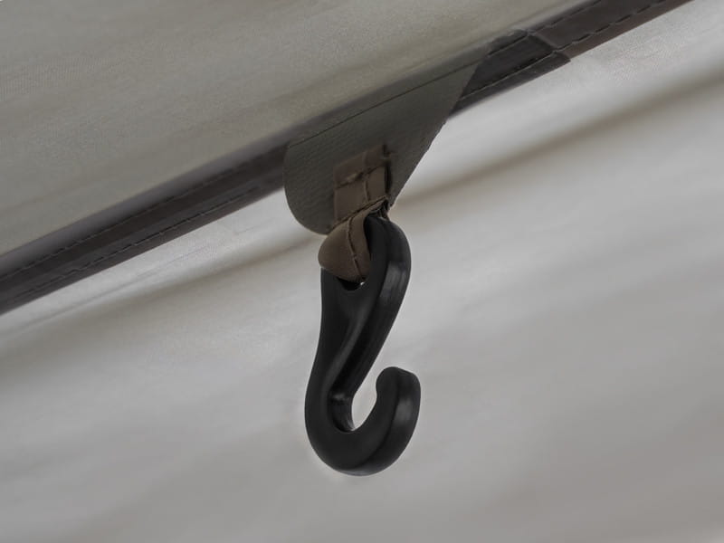 Panel przedni wyposażony jest w cztery zamki błyskawiczne, które w razie potrzeby można wykorzystać do regulacji wejścia lub wentylacji. Posiada również okienko z moskitierą, dzięki któremu zawsze będziesz miał podgląd tego, co dzieje się na Twoim łowisku. Na suficie kempingu znajduje się praktyczny haczyk, przeznaczony do zawieszenia np. lampy lub kurtki i tym podobnych. Kieszeń na tylnej ścianie umożliwia przechowywanie telefonu komórkowego i kluczy, dzięki czemu masz je zawsze pod ręką.