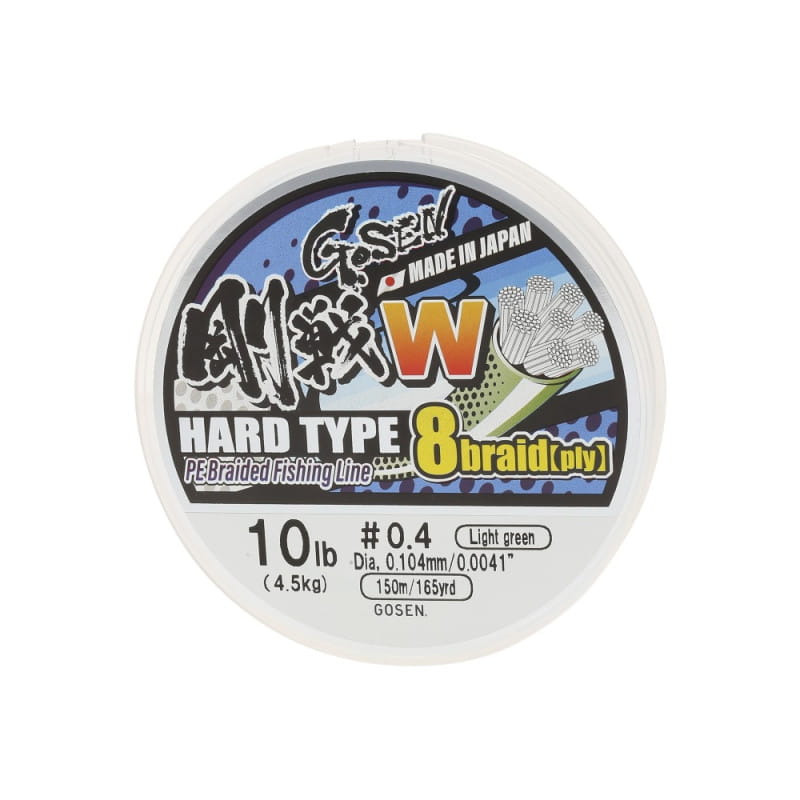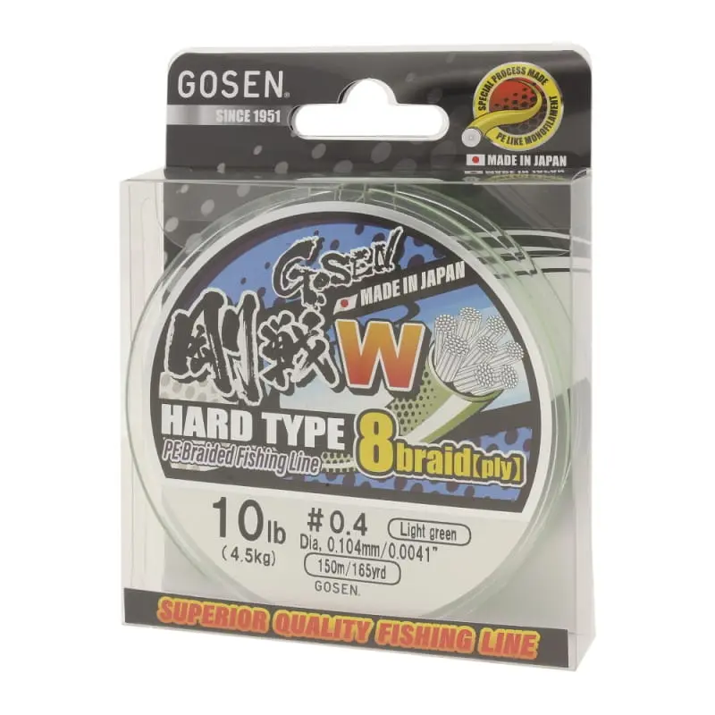 Obecnie na rynku wędkarskim popularne są plecionki wielosplotowe (x4, x8, x12 lub x16) natomiast GOSEN W HARD TYPE to wysokiej jakości japoński materiał jednosplotowy PE o wyjątkowej czułości, okrągłym kształcie, doskonałej wytrzymałości i wysokiej odporności na ścieranie. Produkt sprawdza się w każdych warunkach połowowych, sprawia, że jest łatwo zauważalny przez wędkarza, a dla ryb jest prawie niewidoczny.