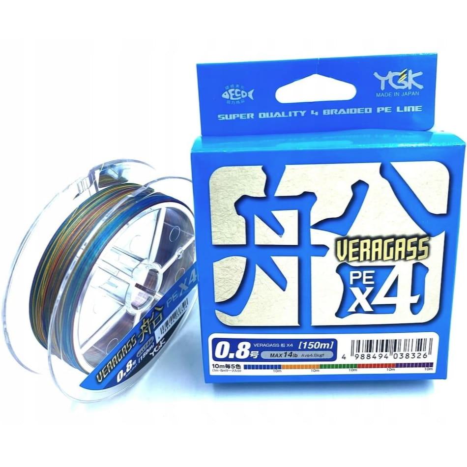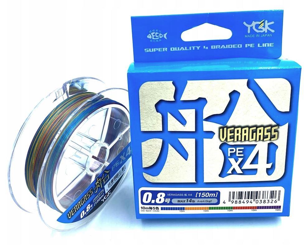 Nowa cztero-splotowa plecionka YGK Veragass PE X4 posiada zdecydowanie gęstszy splot niż G-SOUL przez co jest bardziej odporna na przecieranie i uszkodzenia. Dzięki swojej śliskości bardzo cicho pracuje na przelotkach , jest też odporna na działanie promieni UV. Dla ułatwienia łowienia szczególnie wertykalnego, plecionka podzielona została kolorystycznie na odcinki dziesięciometrowe zawierające pięć różnych kolorów