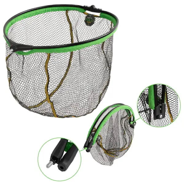 Siatka podbieraka FloateR FoldROUND pokryta jest gumą, która nie wchłania wody i szybko schnie. Dodatkowo jest pokryta zieloną tkaniną na całej ramie od spodu, aby zwiększyć trwałość.