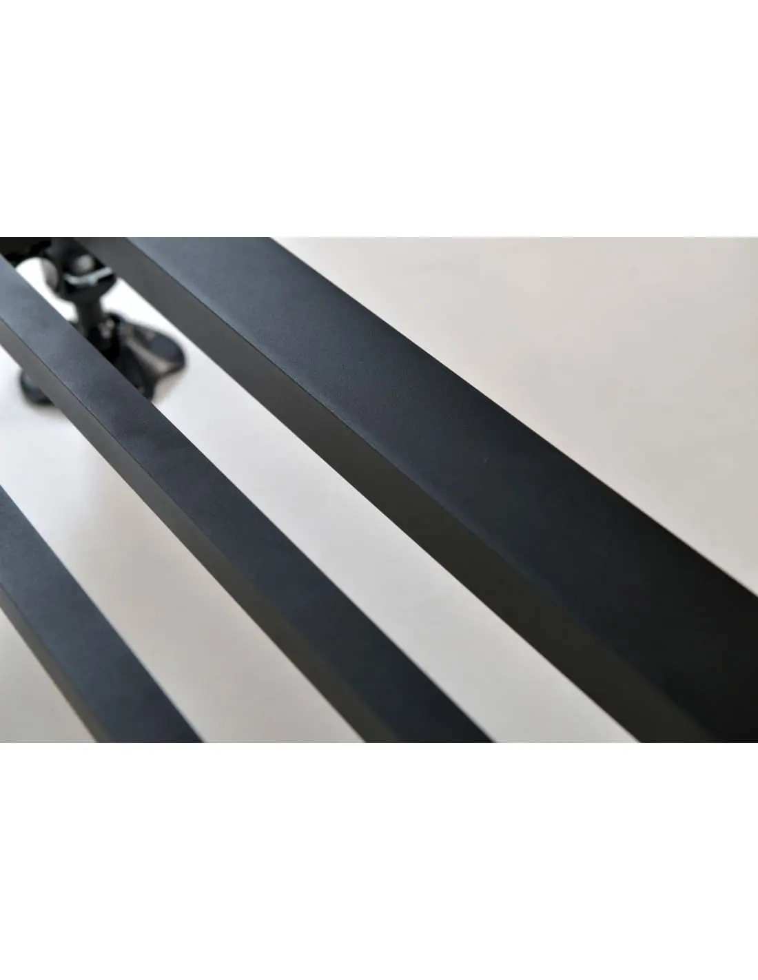 Podnóżek wyposażony jest w cztery teleskopowe nogi fi 25mm (o długości 69cm) oraz dwa łączniki, umożliwiające przymocowanie do CUZO F2, F3 oraz do dowolnego fotela/kosza. Nogi posiadają wkład o długości 25cm co zwiększa długość całkowitą do 99cm oraz stopkę o średnicy 10cm zapewniającą stabilne podparcie na nierównym podłożu. Na czas transportu zaczepiane są za pomocą czarnych uchwytów umiejscowionych pod platformą. System regulacji podestu umożliwia dokręcanie w zakresie 180° co w znaczącym stopniu ułatwia regulację. Każda noga D25 regulowana jest oddzielnie, co umożliwia wypoziomowanie podnóżka w krzywym terenie. Całość aluminiowej konstrukcji została pomalowana kolorem matowym - strukturalnym, co czyni jej powierzchnie szorstką, antypoślizgową.
