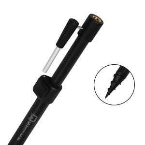 Dolna część sztycy jest wyposażona w solidny i ostry świder, który pozwala wiercić się w twardszye powierzchnie. Ten element ślimakowy jest zabezpieczony sworzniem (nitem), co stanowi ogromną zaletę. W rezultacie nie ma ryzyka, że sam ślimak utknie w ziemi, pozostawiając niefunkcyjną sztycę! Jest to wyjątkowo silne połączenie. U góry znajduje się uchwyt, który wsuwa się w dolną część i służy jako dźwignia podczas wwiercania świdra w twardsze powierzchnie. Koniec górnej części sztycy jest wyposażony w masywny gwint, przeznaczony do zamontowania rodpoda lub elektronicznego sygnalizatora brań.