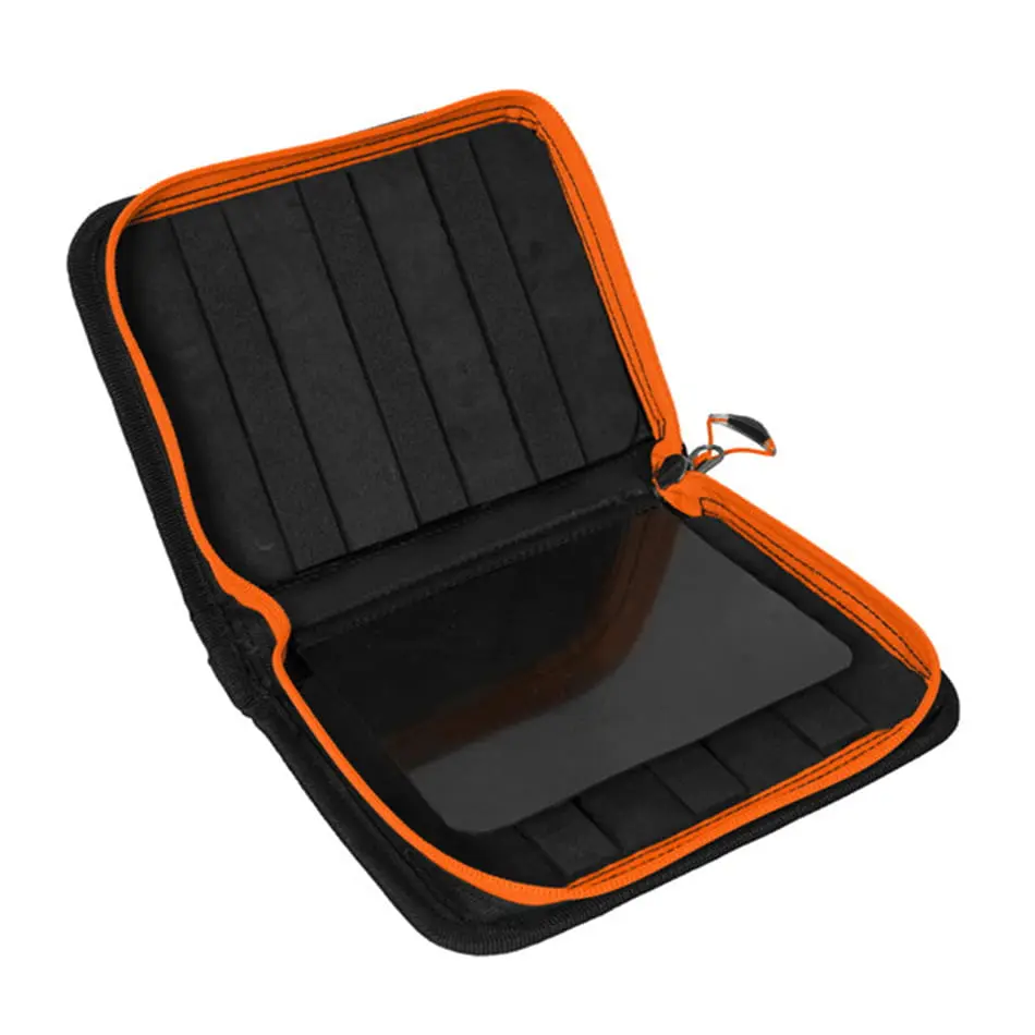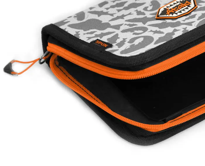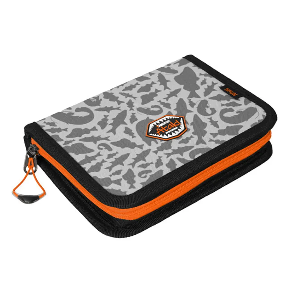 Etui jest wyposażone w wysokiej jakości zamek błyskawiczny w kolorze pomarańczowym. Uchwyt zamka wyposażony jest w plastikowe zakończenie w kolorze pomarańczowym. Jest dość poręczny i umożliwia łatwe otwieranie zamków. Elementy w kolorze pomarańczowym sprawiają, że całość jest lepiej widoczna w ciemności. Pudełko jest uzupełnione przez nasz wyjątkowy szary Kamuflaż ATAK! składający się z kształtów drapieżnych ryb.