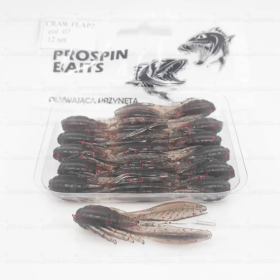 CRAW FLAP2 jest pierwszą przynętą imitującą chrząszcze w asortymencie PROSPIN BAITS. Guma ta idealnie nadaje się do metody Dropshot oraz do stosowania z główką jigową.
