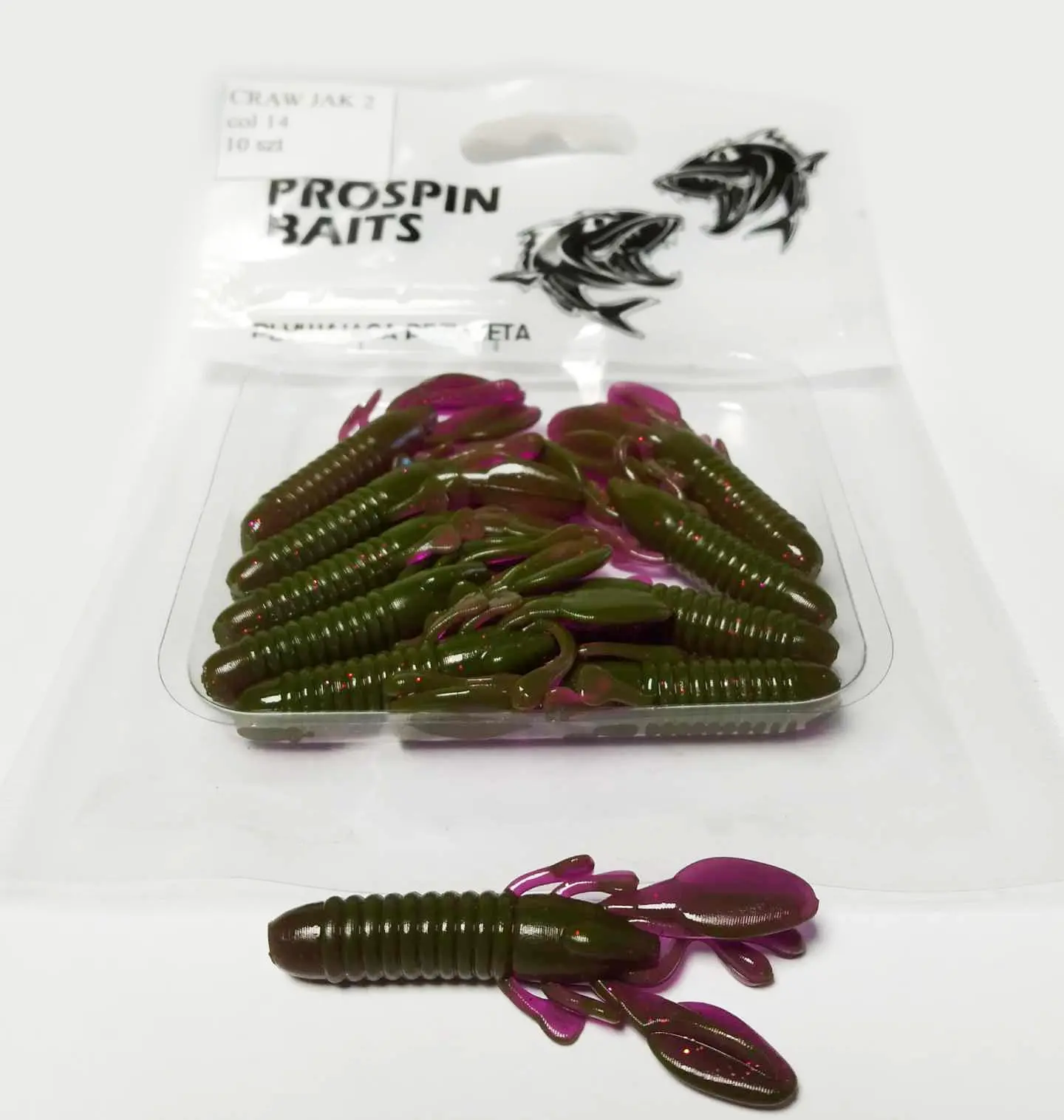 Raki znajdują się w menu wszystkich drapieżników a szczególnie okoni. PROSPIN CRAW JAK doskonale imitują słodkowodne raczki. Korpus jest niezwykle giętki a szczypce poruszają się nawet przy najdelikatniejszym ruchu co prowokuje okonie do najbardziej agresywnych ataków. Dodatkowe czułki i kończyny zwiększają jeszcze realizm tej przynęty. Nasączono je też słonym zapachem rybnym. Najlepiej sprawdzają się prowadzone krótkimi szarpnięciami wzdłuż dna.