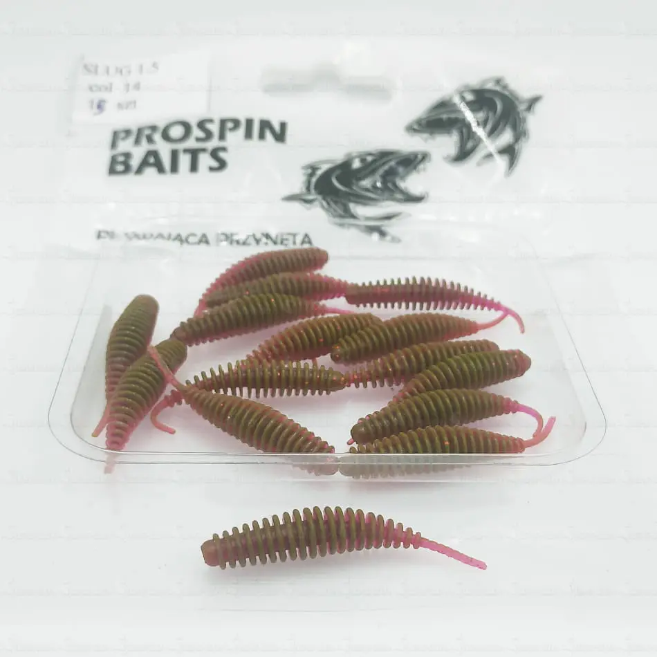 Przynęta PROSPIN SLUG 1.5 została stworzona z myślą o pstrągu, okoniu czy jaziu. Ślimaki wystapują w rozmiarze 4cm, w wersji pływającej, zapachowej, wykonane z bardzo mięciutkiego materiału. Możecie je zabrać ze sobą, gdy szukacie okonia, klenia, czy pstrąga. Podczas testów okazało się także, że polubiły je nie tylko drapiezniki, ale również ryby spokojnego żeru, zazwyczaj nie łowione metodą spinningową, takie jak wzdęgi, leszcze, karasie, czy nawet karpie.