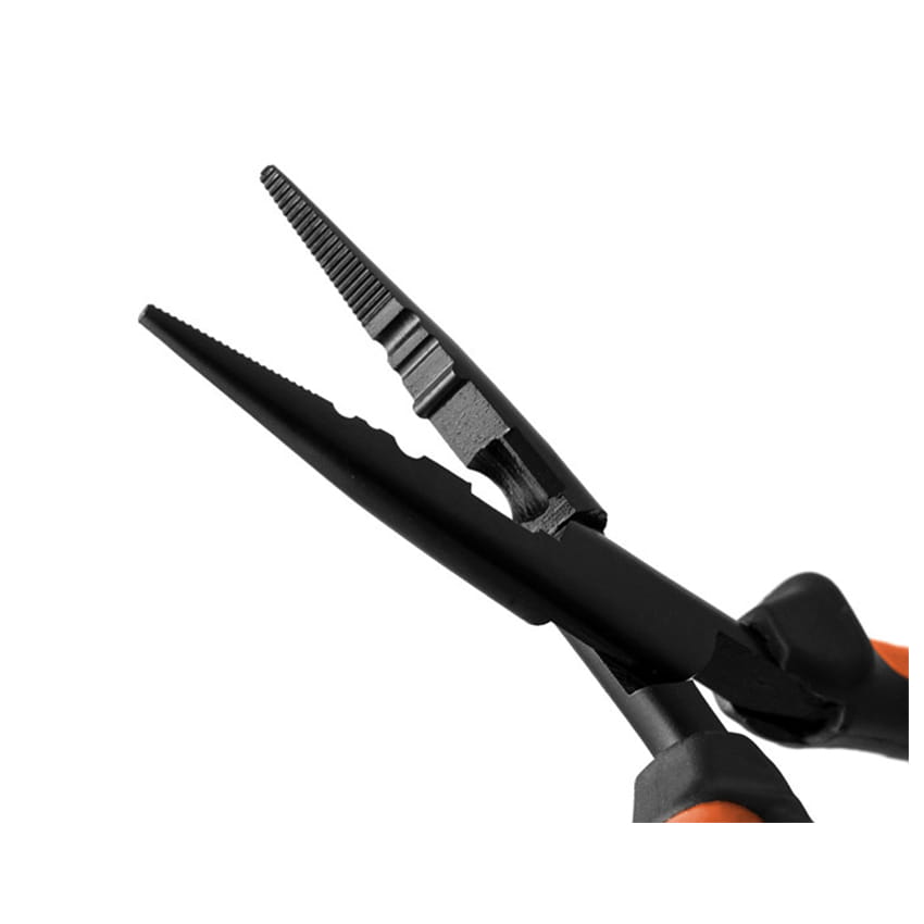 Delphin MULTI to długie szczypce, które mają za zadanie uwolnić haczyki z pysków drapieżnych ryb w przypadkach, gdy klasyczny szczypce nie wystarczą. Ich długość wynosi 18 cm. Wewnętrzna strona szczypiec ma wystarczająco szorstką powierzchnię, aby chwycić nawet duże podwójne i potrójne kotwiczki. Ponadto ich szczęki są wyposażone w zintegrowane obcinaczki, a także część do zaciskania o szerokości 9 mm. Obie części wykonane ze stali wysokowęglowej z rączkami z pomarańczowego i czarnego tworzywa sztucznego, które są dobrze widoczne w każdych warunkach i są dopasowane do dłoni. W obu rączkach znajdują się otwory do zamocowania pasków. Za pomocą naszych szczypiec MULTI możesz teraz szybko i bezpiecznie pozbyć się haczyków.