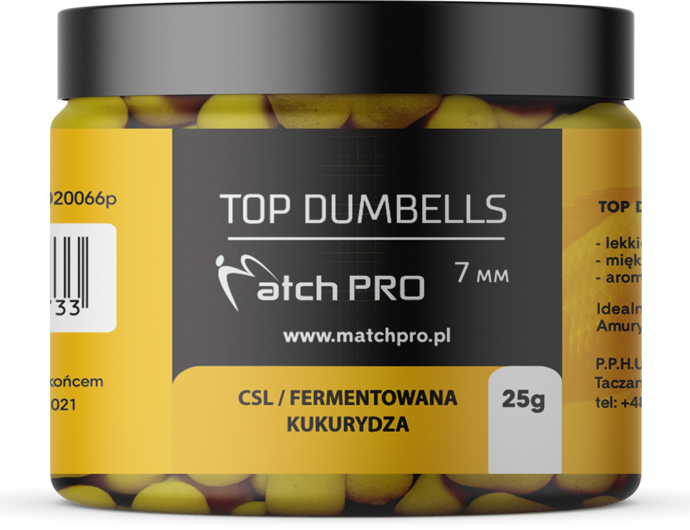 Seria najwyższej jakości przynęt o kształcie wałka (dumbells) w rozmiarze 7mm. Długie i intensywne testy tych przynęt pozwoliły dopracować ich skład i właściwości tak aby były bardzo skuteczne w każdych warunkach. To co wyróżnia Matchpro Top Dumbells to idealna miękkość, dzięki której ryby pewnie ją pobierają. Wyjątkowa lekkość przynęty zapewnia bardzo naturalne zachowanie się w wodzie co niezwykle podnosi skuteczność łowienia. Top Matchpro Dumbells są bardzo aromatyczne, oddając przez długi czas równomiernie aromat w wodzie co przekłada się na dużą ilość brań. Różnorodność smaków i kolorów pozwala dopasować się każdemu wędkarzowi do aktualnych warunków panujących na łowisku.