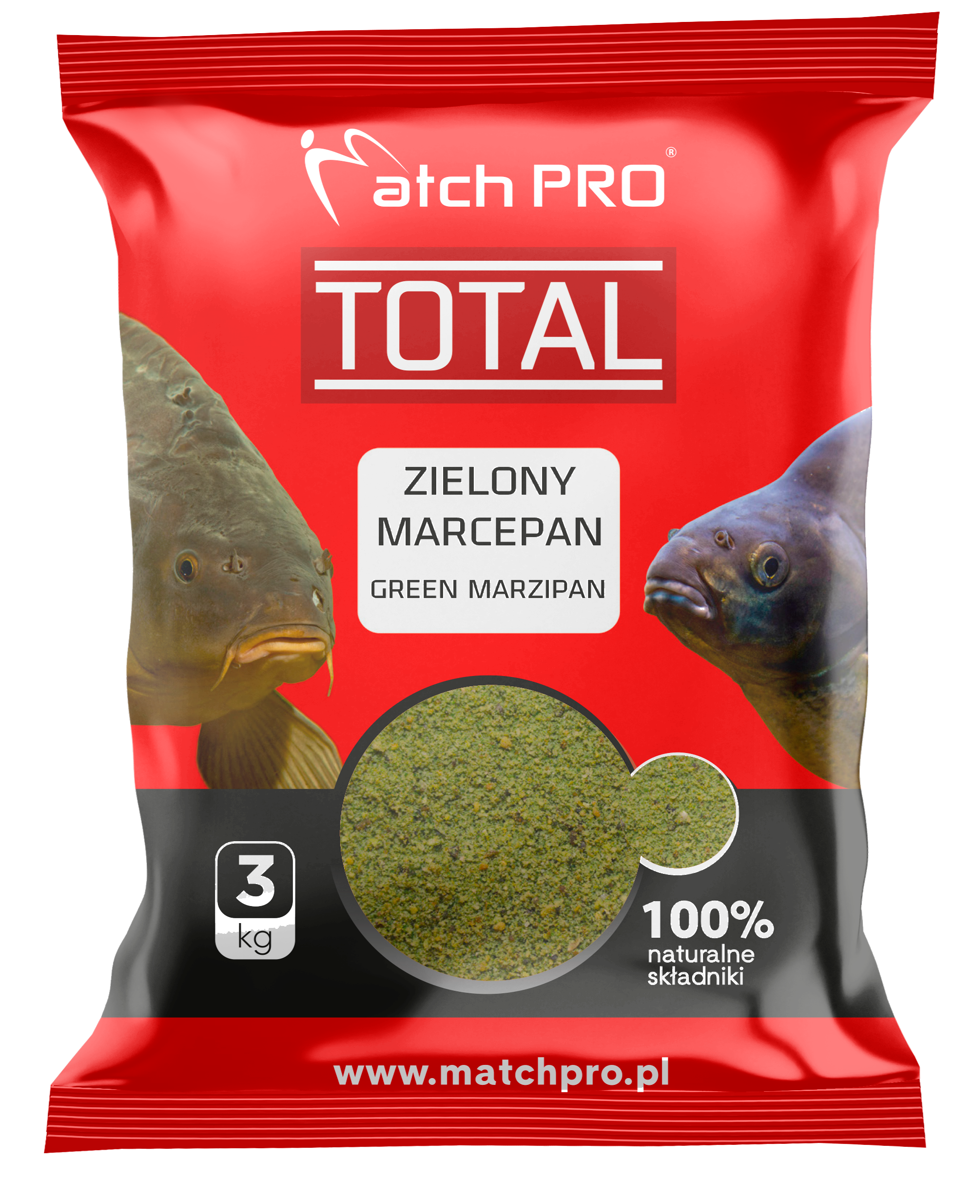 TOTAL ZIELONY MARCEPAN - zanęta, opracowana specjalnie do połowu ryb karpiowatych, takich jak karp, leszcz, lin, karaś i płoć. Jej intensywny aromat marcepanu, połączony z unikalnym zielonym kolorem, sprawia, że jest niezwykle skuteczna na wielu łowiskach. Dzięki odpowiedniej frakcji i wysokiej jakości składnikom, zanęta dobrze pracuje w wodzie, tworząc atrakcyjną chmurę zanętową, która przyciąga ryby i utrzymuje je w rejonie nęcenia przez długi czas. Jest skuteczna przez cały sezon, jednak szczególnie dobrze sprawdza się w cieplejszych miesiącach, gdy ryby preferują słodkie i intensywne aromaty.