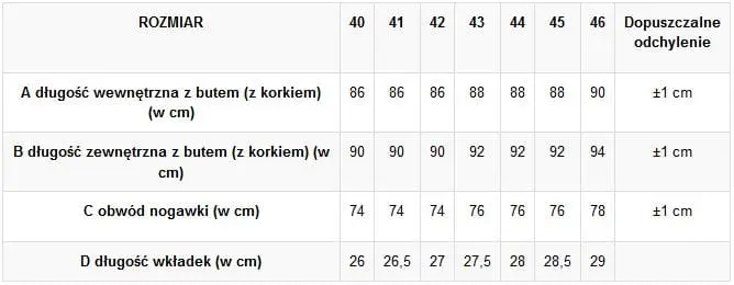 odchylenieA długość wewnętrzna z butem (z korkiem) (w cm) 86 86 86 86 88 88 88 90 90 ±1 cm B długość zewnętrzna z butem (z korkiem) (w cm) 90 90 90 90 92 92 92 94 94 ±1 cm C obwód nogawki (w cm)