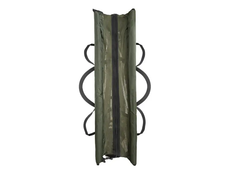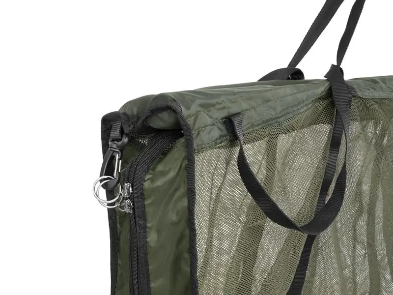 Siatka jest wzmocniona dwoma czarnymi paskami tekstylnymi, które przechodzą w centralny uchwyt. Dzięki długim uchwytom torbę można łatwo zawiesić na wadze. Torba posiada również tekstylne uchwyty po obu stronach ułatwiające podnoszenie i przenoszenie. Solidny zamek błyskawiczny znajduje się po obu stronach i na górze, umożliwiając całkowite rozpięcie CWS w celu wygodniejszego przenoszenia ryb.