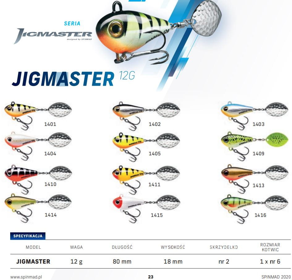 Przynęty Spinmad Jigmaster to wirujące ogonki zaprojektowane do łowienia szczupaków. Zastosowanie nowej technologii i materiałów pozwoliło na powiększenie wabików do ulubionych szczupaczych rozmiarów nie zwiększając ich wagi. Dzięki temu wabiki doskonale spisują na "szczupakowych" miejscówkach.