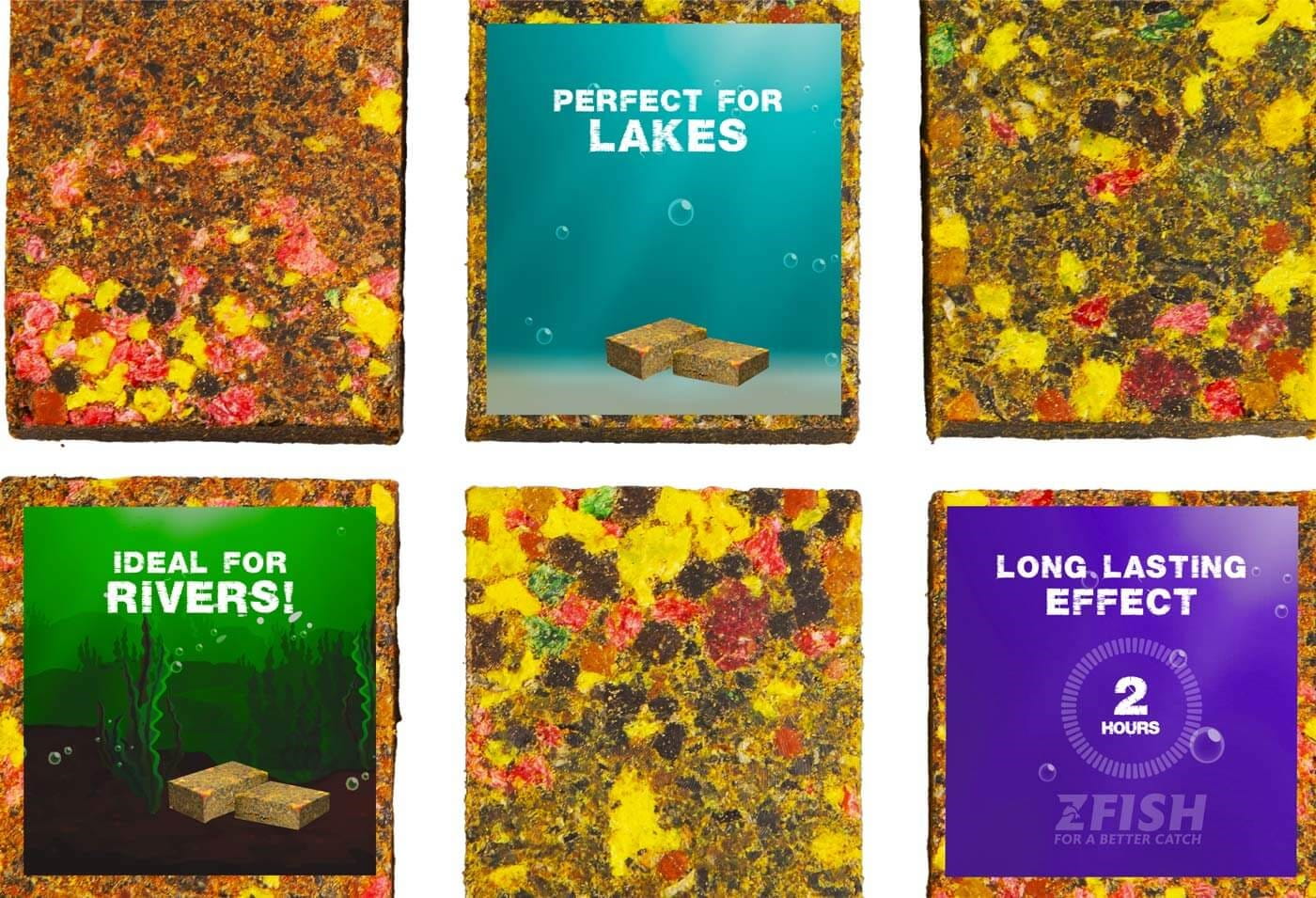 Brykiety ZFISH to nowy, interesujący dodatek do naszego programu żywieniowego. Jest to bardzo wysokiej jakości, prasowany pod ciśnieniem, drobny granulat z mieszanką paszową i płatkami angielskimi, w kształcie małych bloków (brykietów). Ogromną zaletą tych "brykietów" jest ich naprawdę powolne i stopniowe rozpuszczanie oraz tworzenie gęstej i długotrwałej "chmury" rozpuszczonej paszy. Stosowanie tych brykietów jest bardzo łatwe i wszechstronne i może być używane przez cały rok, zarówno w zimnej, jak i ciepłej wodzie.
