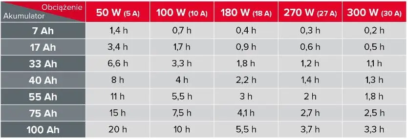 Podstawą właściwego działania awaryjnego zasilacza Rebel jest prawidłowo dobrany akumulator. Aby dobrać odpowiednie urządzenie, należy skorzystać z przybliżonego wzoru: 100 W obciążenia = 10 A poboru z akumulatora.