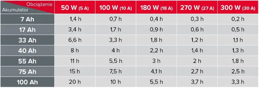 Podstawą właściwego działania awaryjnego zasilacza Rebel jest prawidłowo dobrany akumulator. Aby dobrać odpowiednie urządzenie, należy skorzystać z przybliżonego wzoru: 100 W obciążenia = 10 A poboru z akumulatora.