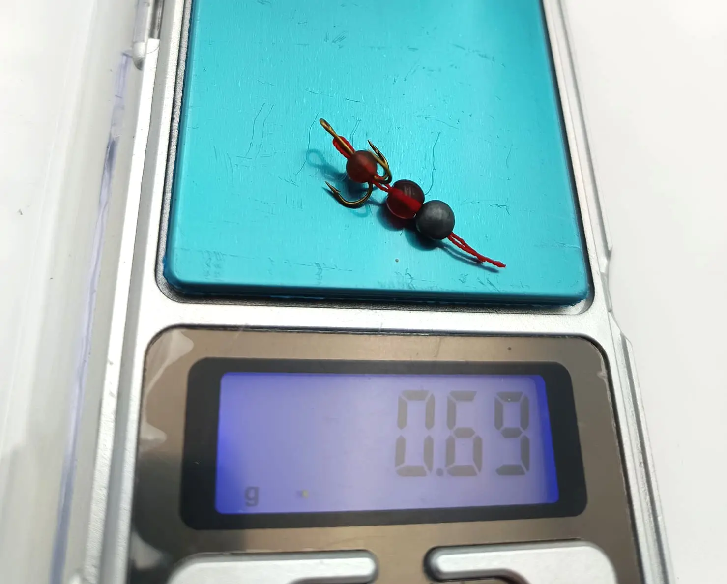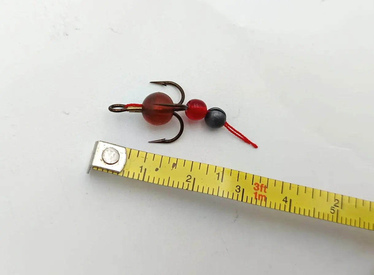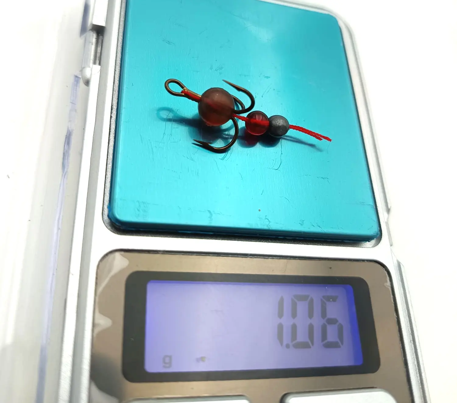6szt kotwicznek z dociążeniem i koralikiem przesuwnym na czerwonej nitce imitującej ochotkę. Koralik przy gwałtowniejszym ruchu powoduje uderzenie i lekki hałas- inspiracja metodą Carolina i Texas.