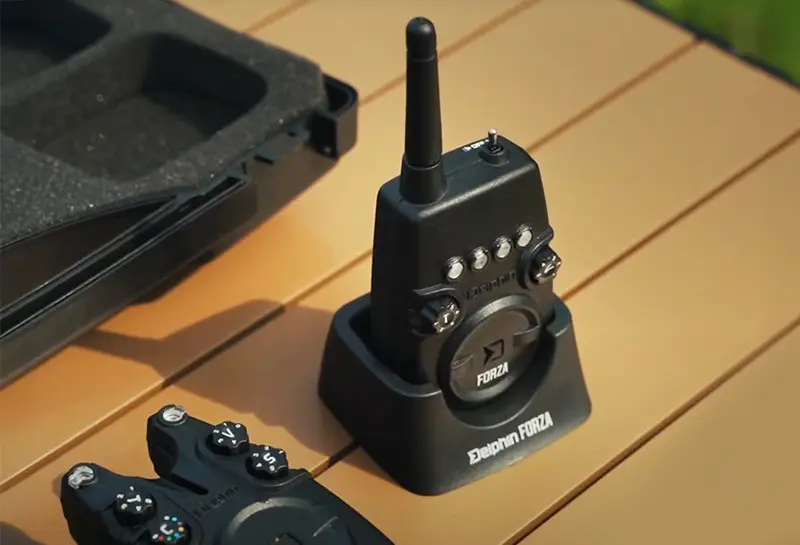 Delphin FORZA Life+ to zestaw sygnalizatorów brań zapewniających niezawodną sygnalizację świetlną, dźwiękową lub wibracyjną w każdych warunkach. Korpus sygnalizatorów i centralki wykonany jest z czarnego solidnego tworzywa ABS, co gwarantuje odporność na uszkodzenia mechaniczne. Absolutna odporność na wodę to również aspekt, który przyczynia się do jego długowieczności. Każde urządzenie sygnalizacyjne można przełączać w tryb dzienny lub nocny za pomocą dźwigni. W trybie nocnym zaświeci się dioda LED pozycji sygnalizatora, dzięki czemu zawsze będziesz mieć podgląd pozycji wędki. Sygnalizatory mają szeroki zakres wybieranych parametrów. Sygnał dźwiękowy (przełącznik T) i czułość w zakresie 1-9 cm (przełącznik S) można wybrać z maksymalnie pięciu opcji, zgodnie z wymaganiami. W przypadku brania wstecznego zostaniesz powiadomiony innym tonem. Głośność można również regulować na pięciu różnych poziomach, przy czym poziom 0 oznacza tryb cichy. Niekwestionowanym bonusem sygnalizatorów z zestawu FORZA Life+ jest możliwość wyboru spośród 7 kolorów sygnalizacyjnej diody LED. Każdy wybiera swojego faworyta i chcąc zmienić po prostu wybierasz inny kolor przełącznikiem obrotowym „C (kolor)” i nie musisz kupować nowego sygnalizatora. Na dole znajduje się wejście dla złącza 2,5 mm. Dodatkowo każdy sygnalizator posiada gwinty do mocowania Snag gear, są one częścią zestawu.